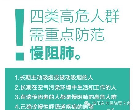 慢性阻塞性肺疾病(COPD,简称慢阻肺)是一种慢性呼吸道疾病,已成为全球第四大致死疾病。目前,全球有6亿人患有COPD,我国40岁以上人群中患病率高达8.2%。世界卫生组织将每年11月第三个周三定为“世界慢阻肺日”,今年的主题为“breath in the knowledge,科学呼吸”。慢阻肺即慢性阻塞性肺疾病,以不完全可逆的气流受限为特点。慢阻肺气流受限常呈进行性加重,并伴有对有害颗粒或气体,主要是吸烟所致的肺部异常炎症反应。虽然慢阻肺直接累及肺,但也可引起显著的全身效应。慢阻肺与慢性支气管炎和肺气肿密切相关。当患者有咳嗽、咳痰或呼吸困难症状和(或)疾病危险因素接触史时,应考虑慢阻肺。慢性咳嗽、咳痰常先于气流受限许多年存在,为提高大众对COPD的认识,呼吁全社会共同关注慢性呼吸系统疾病,洛阳东方医院呼吸内科发起的“生命在于呼吸”健康宣教活动将于11.16世界慢阻肺日举行。