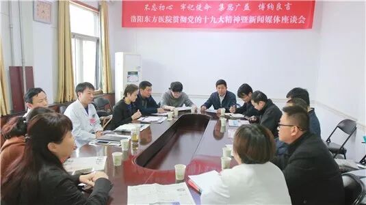 11月3日,“中国记者节”来临前夕,洛阳东方医院邀请洛阳日报、洛阳晚报、洛阳网、医药卫生报、大河健康报、东方今报、今日头条、一拖东方健康频道等媒体的记者朋友和洛阳市卫生计生委宣教科的有关同志,召开“贯彻党的十九大精神,喜迎中国记者节暨新闻媒体座谈会”,共同就如何更好的开展洛阳东方医院宣传工作、打造品牌、树立形象,进行深入的探讨。座谈会由党委书记助理苏永立主持,工会主席张亚东以及相关职能科室代表参加了会议。