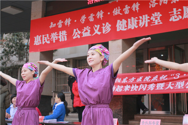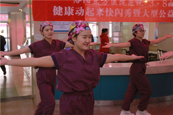 3月8日08:00,一群花帽紫衣的女孩随着欢快的乐曲舞动起来,洛阳东方医院庆祝“3.8妇女节”《健康动起来快闪秀暨大型公益义诊活动》在门诊大厅拉开序幕,这群美丽的女孩都是洛阳东方医院的医护人员,快闪秀吸引了就诊的人群。