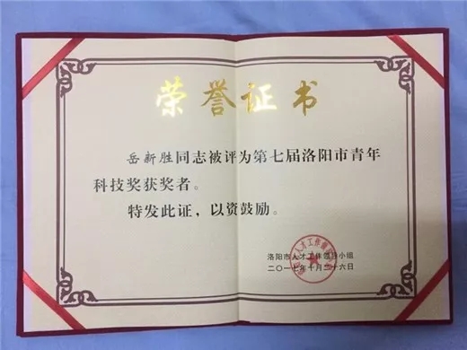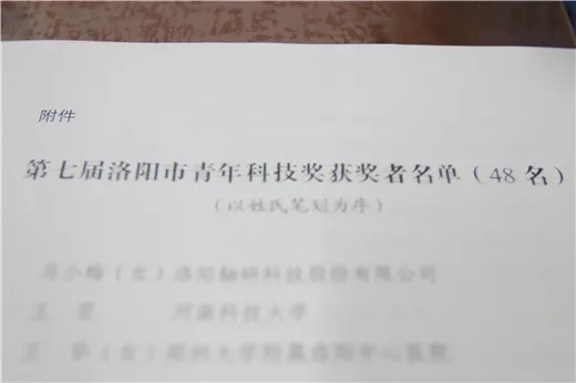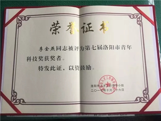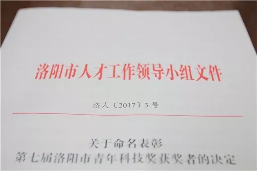 洛阳市优秀青年科技奖是市级层面表彰青年科技人才的最高荣誉。旨在表彰在自然科学研究领域取得重要的、创新型成果和做出重要贡献,并有显著应用成效的,在工程技术方面取得重要的、创新型成果和做出重要贡献,产生显著的社会效益或经济效益的,年龄在40周岁以下的优秀男青年科技工作者,45周岁以下的优秀女青年科技工作者。经专家组评审组评审并提名,洛阳市青年科技奖评审工作领导小组决定授予全市各个领域的48名同志“洛阳市第七届青年科技奖”。