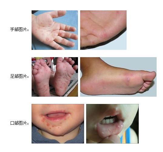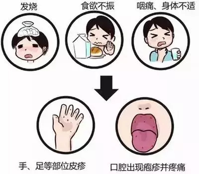急性起病,发热、口痛、厌食、口腔黏膜出现散在疱疹或溃疡,位于舌、颊黏膜及硬腭等处为多,也可波及软腭,牙龈、扁桃体和咽部。手、足、臀部、臂部、腿部出现斑丘疹,后转为疱疹,疱疹周围可有炎性红晕,疱内液体较少。手足部较多,掌背面均有。皮疹数少则几个多则几十个。消退后不留痕迹,无色素沉着。部分病例仅表现为皮疹或疱疹性咽峡炎。多在一周内痊愈,预后良好。部分病例皮疹表现不典型,如单一部位或仅表现为斑丘疹。