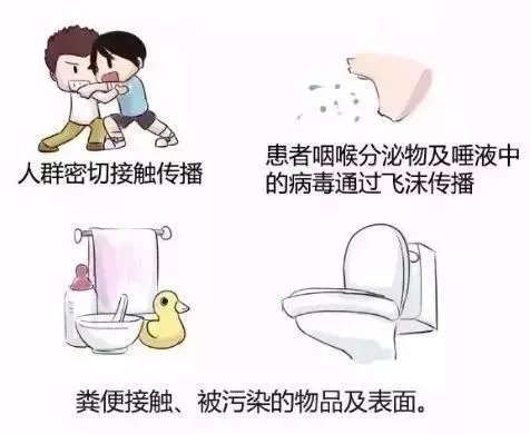 有多种肠道病毒可引起手足口病。最常见的是柯萨奇病毒A16型及肠道病毒71型。其感染途径包括消化道,呼吸道及接触传播。